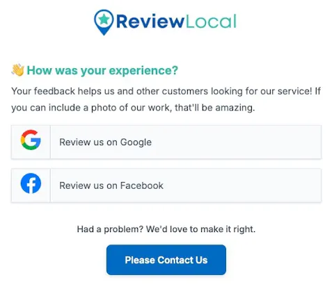 The 'Please Contact Us' button gives unhappy customers a private way to reach you directly, before they leave a negative review. Resolve the issue, protect your rating.